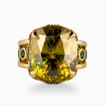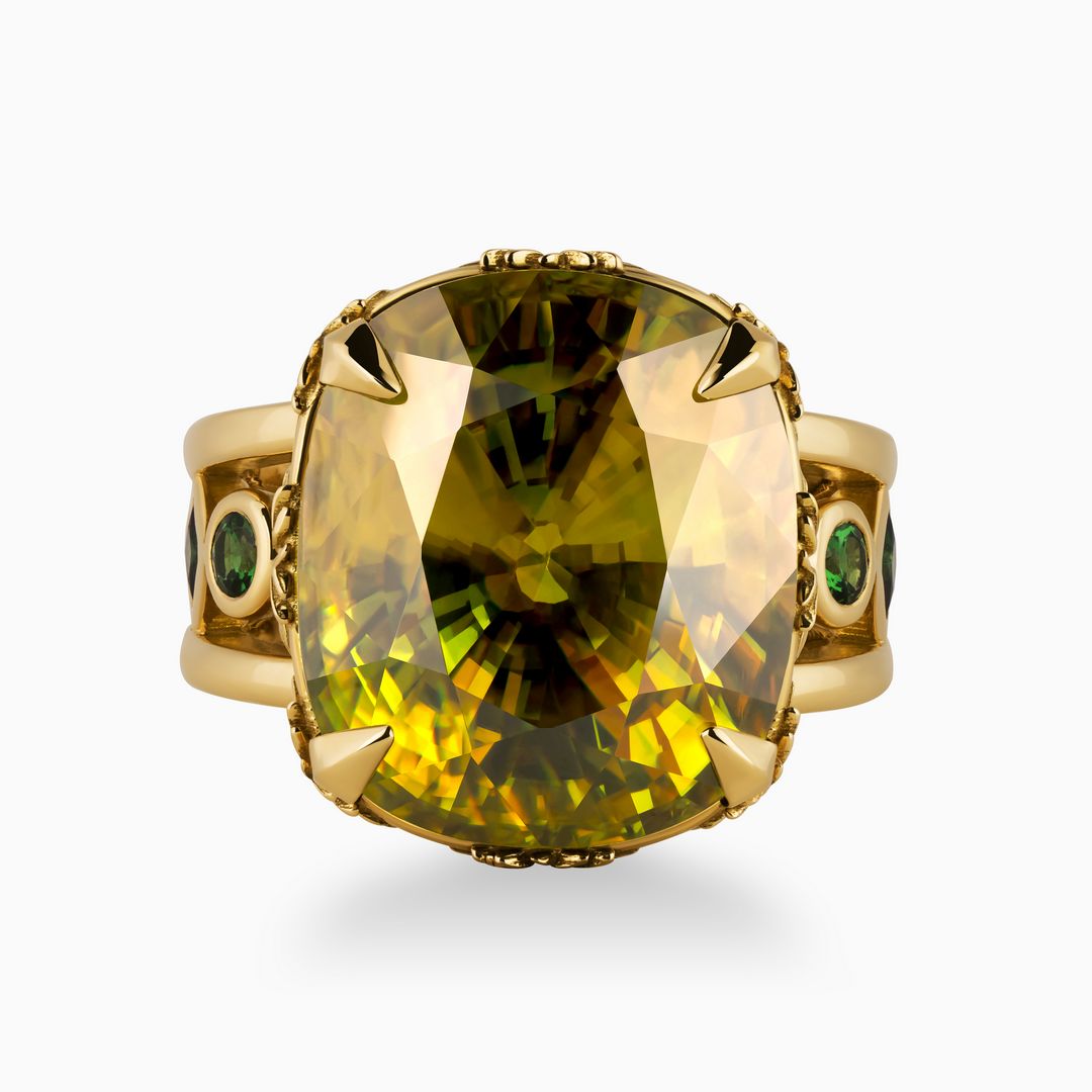 The Palm Beach Ring was designed by award winning designer Robin Callahan exclusively for Palm Beach Gems by Nicole. The ring showcases an impressive 17.75 carat Sphene from Madagascar with Citrine and Tsavorite Garnet accents on its geometric shank. No detail should be missed, as even the gold is crafted to delicately display the beautiful Florida Palms holding up the golden-green brilliance of the Sphene.